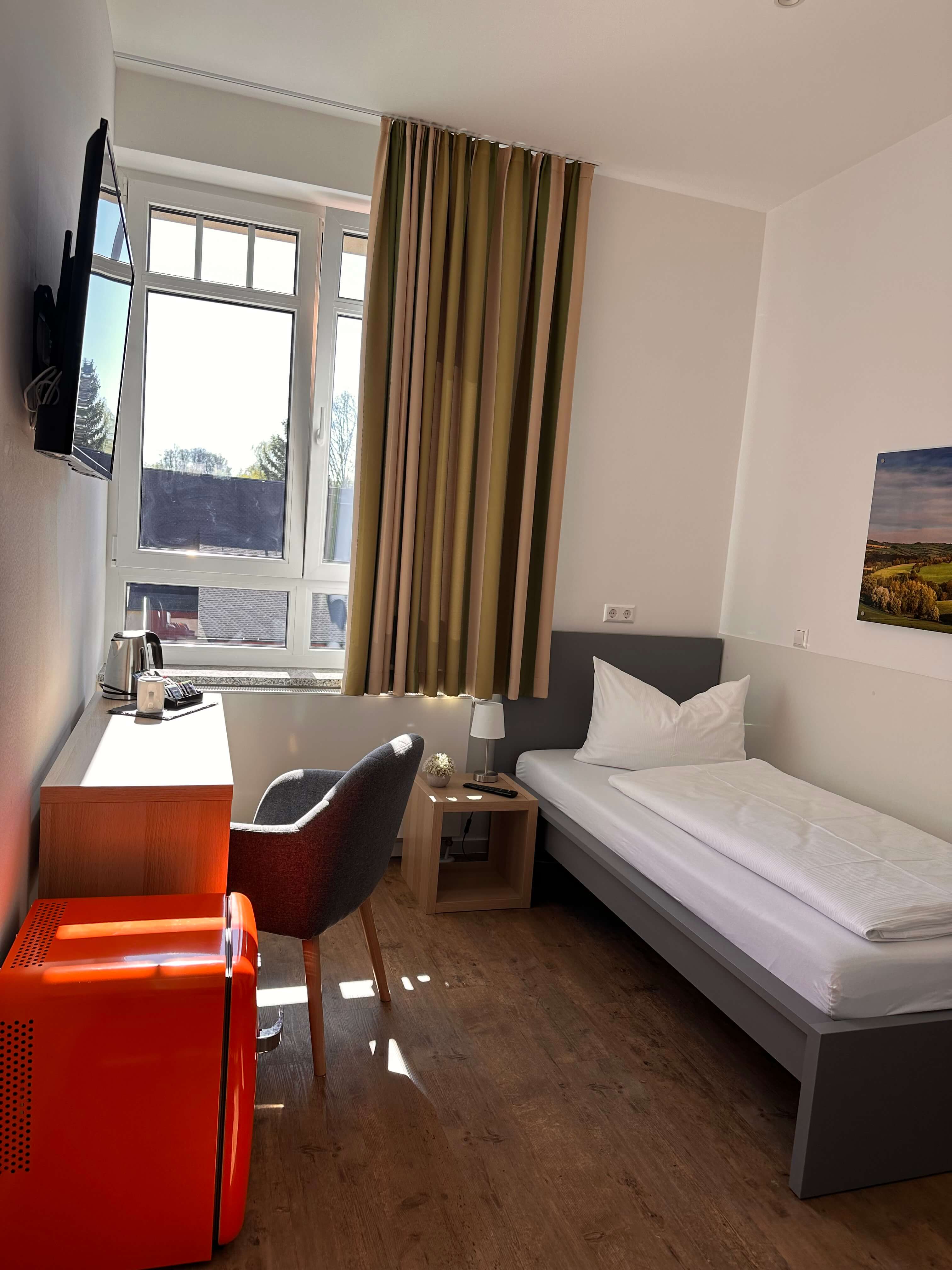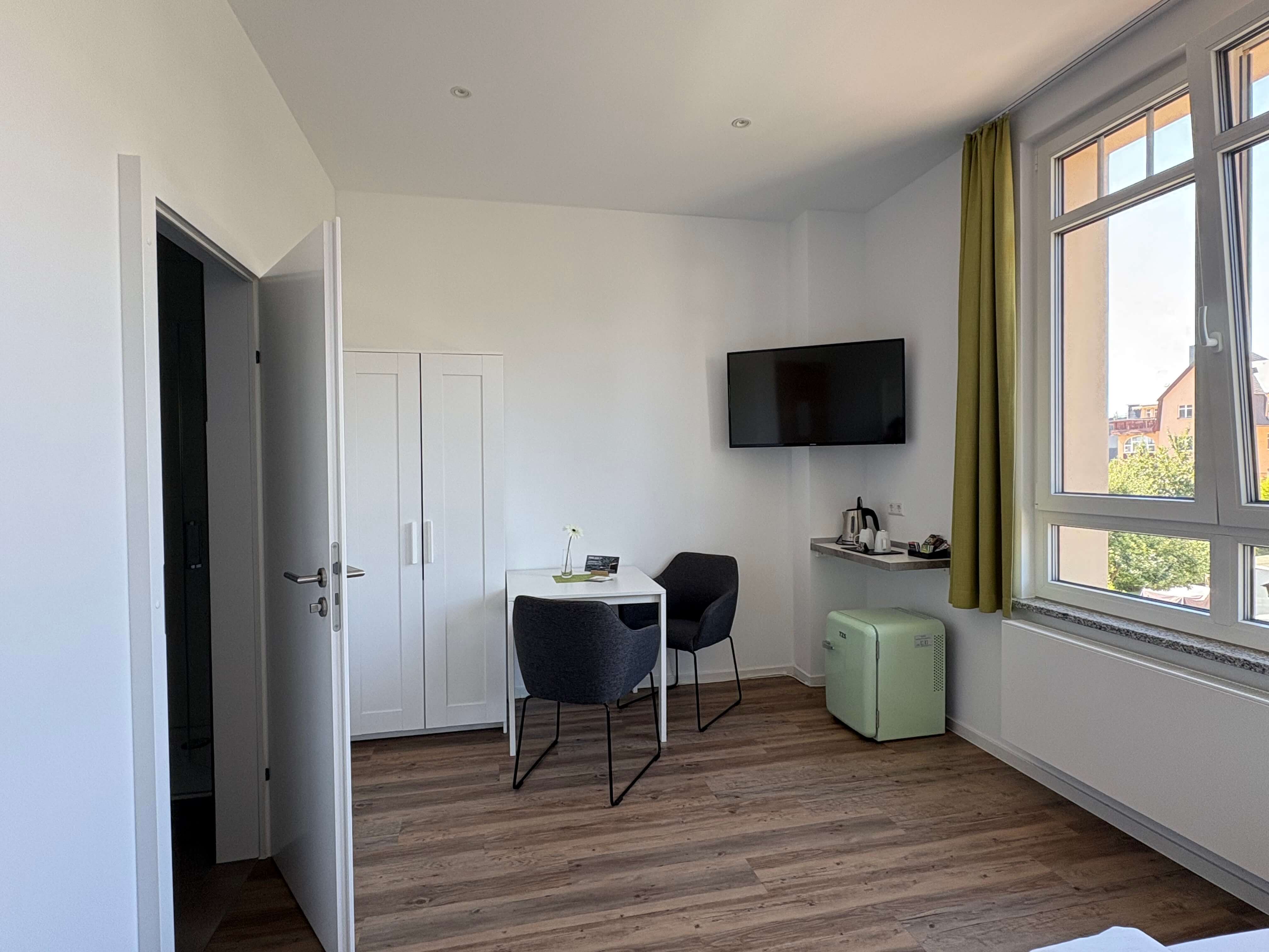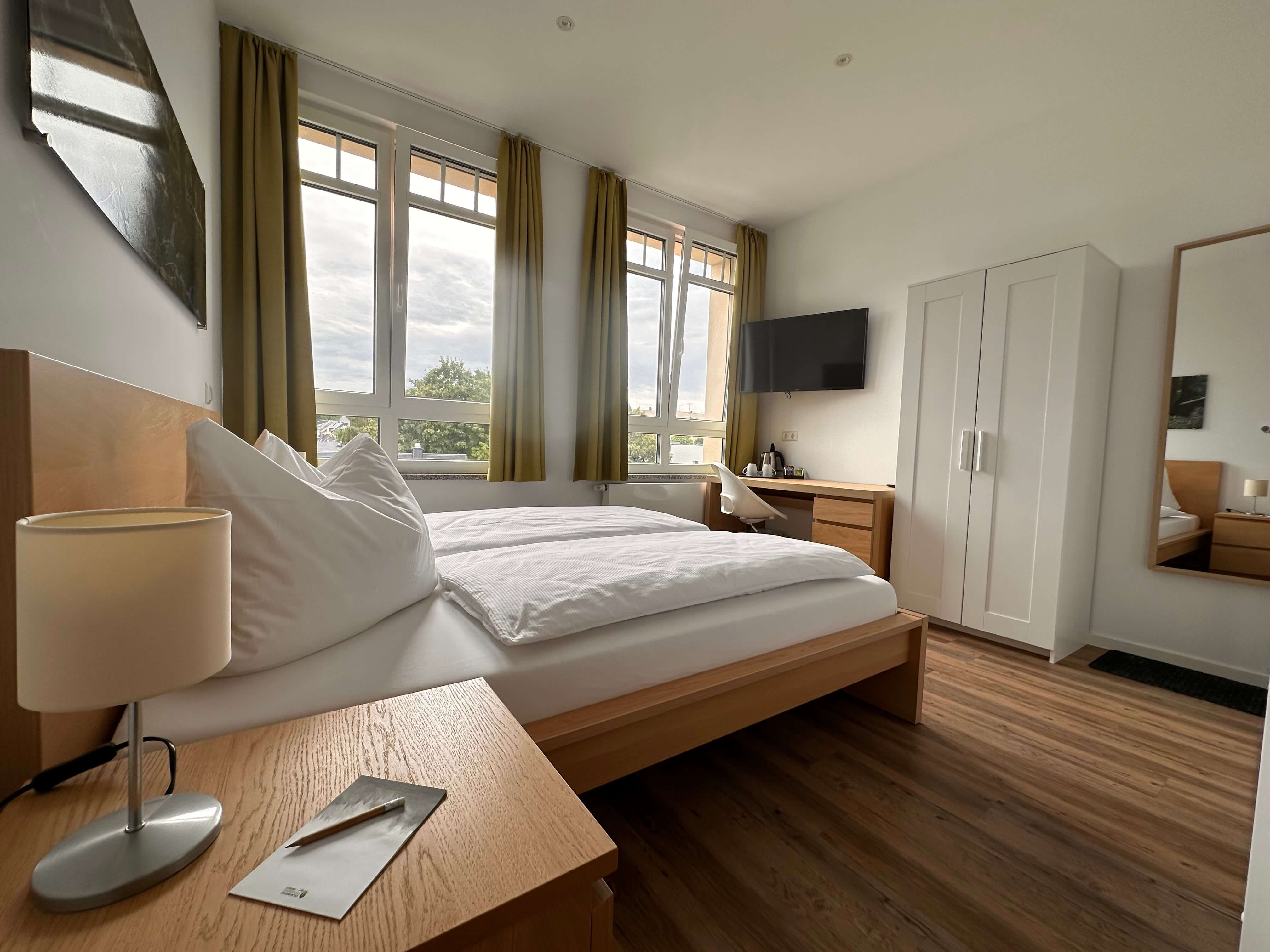 Das Budget Doppelzimmer verfügt über ein Doppelbett (160x200cm), einen Kleiderschrank, einen Schreibtisch und Schreibtischstuhl.