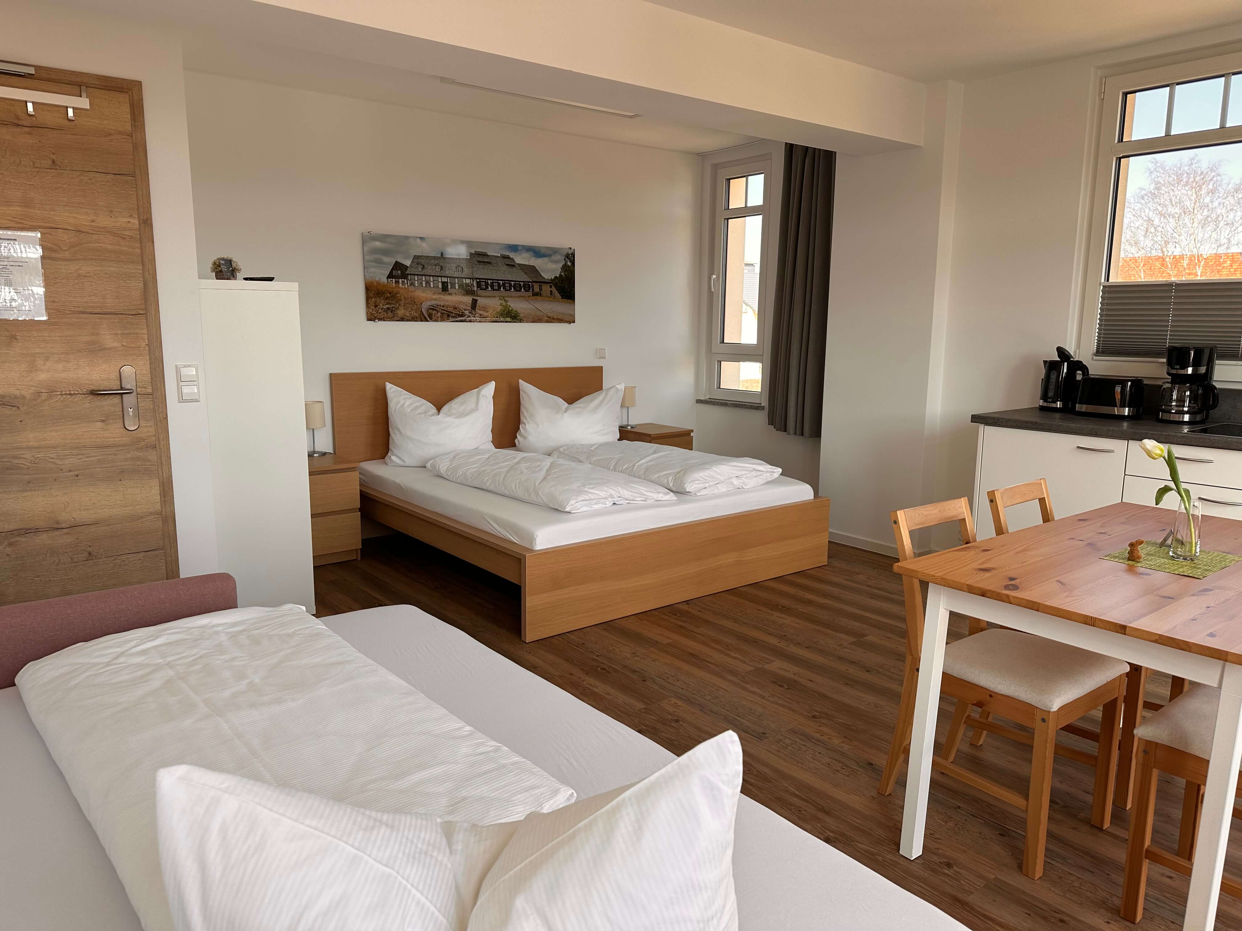 Die drei Doppelzimmer verfügen jeweils über ein großes Doppelbett (180x200 cm), einen Kleiderschrank sowie eine kleine Sitzecke.
